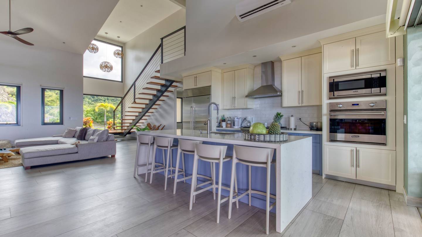 Très spacieuse, la villa principale comprend 6 suites avec salles de bains adjacentes, dont cinq dotées d'une vue mer, une lumineuse salle de séjour, une cuisine ouverte pourvue d’un îlot central, une vaste terrasse partiellement ombragée et une piscine à débordement.